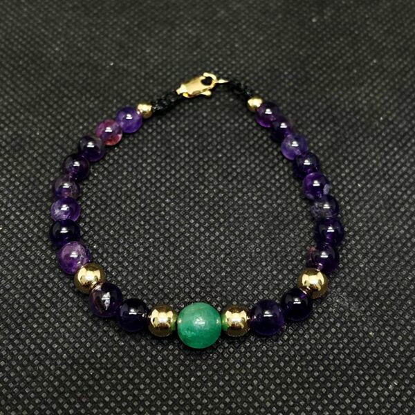 La pulsera esta elaborada con esmeraldas colombiana de 5 quilates (peso aproximado), balines de oro laminado 18k y amatistas naturales . Calibre 6 milímetros.